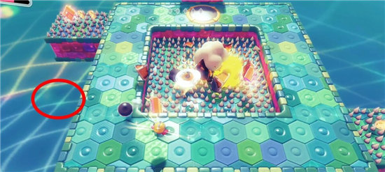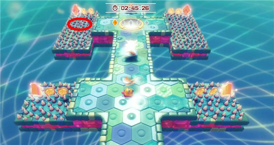 然后把飞镖扔在左边红圈处并停在那里,操控卡比往正上方走,等收到宝石后,跳起来把台子上的敌人和宝石一起收了,然后去打右边的宝石,时间就能控制在1分钟以内。