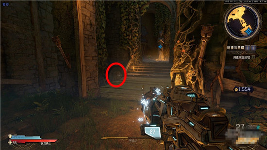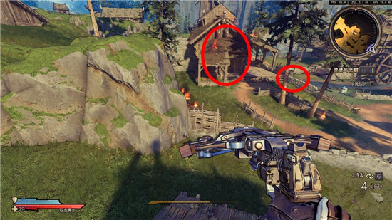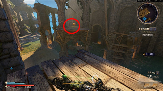 继续前进就会看到一个废弃的城堡,还能遇到腥云(不是银河护卫队的星云)。接着把出现的敌人全部清理掉就OK了。清理掉敌人,沿着木板爬上去,能够获得护盾(护盾是什么,新手教程我说过了,这里就不讲!)。离开的时候需要炸开碎石,瞄准发红光的木桶射击就行。