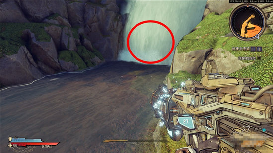 进入下一个村落,直接跳入水里,左侧有一个瀑布,进入瀑布内部可以获得一个【幸运骰子】和宝箱。