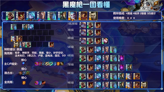 8人口对应就是根据转职开6黑魔或者没有转职就是4黑魔+4枪手,没有爆爆就上名流即可,卢锡安能三星就不存钱,三星卢锡安后期很强,没有爆爆的话上希尔科也可以。