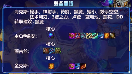 核心蓝BBUFF,卢锡安不是特备挑输出装,一般的法系输出装卢锡安都可以用,最佳就是法爆,鬼书的话打白魔阵容更强,其余6人口补不出来帽子/法爆/鬼书的话,正义和电刀就直接合了,因为6/7人口一定不能掉血的。