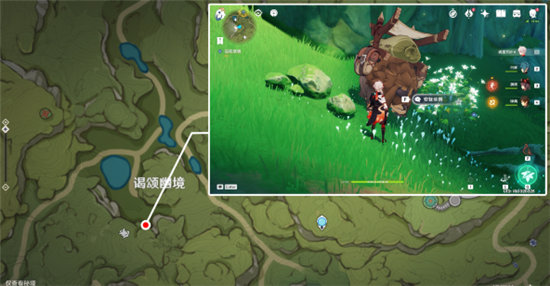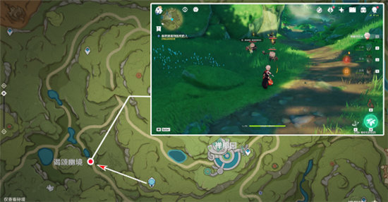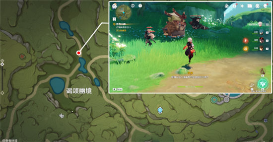 在下图所示位置,我们遇到一个被丘丘人围攻的人,看样子他解决不了眼下的麻烦,我们还是快去帮帮他吧。