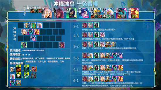 金铲铲之战手游这款里面提供了非常多不同的阵容,每一个阵容都有着自己的好处,可以挑战不同的关卡等等,所以很多小伙伴们还不知道一些阵容该如何进行搭配,小编今天就要来介绍一下冲锋冰鸟阵容攻略,这个阵容是很多小伙伴们都想要搭配的,但是一直不知道该如何进行搭配,所以小伙伴们只需要跟着小编,小编在下方呢都帮你们总结出来了非常详细的搭配攻略,让你们可以轻松挑战不同的玩家和模式,轻轻松松的取得游戏的胜利,感兴趣的小伙伴们就不要错过了;