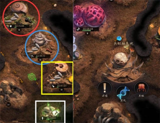 兵种孵化需要近卫蚁孵化地(红色圈),射手蚁孵化地(蓝色圈),运输蚁孵化地(黄色框),结茧介质(白色框),兵蚁栖息地。