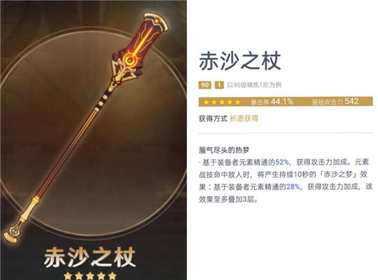 赛诺专武,最适合赛诺的武器,90级增加44.1%暴击率,再加上赛诺突破增加暴击伤害 ,让赛诺面板变得更容易成型。赛诺既需要叠精通又需要攻击力,而赤沙的天赋可以在叠精通的情况下增加攻击力,适合赛诺的同时也完美契合饰金四件套。